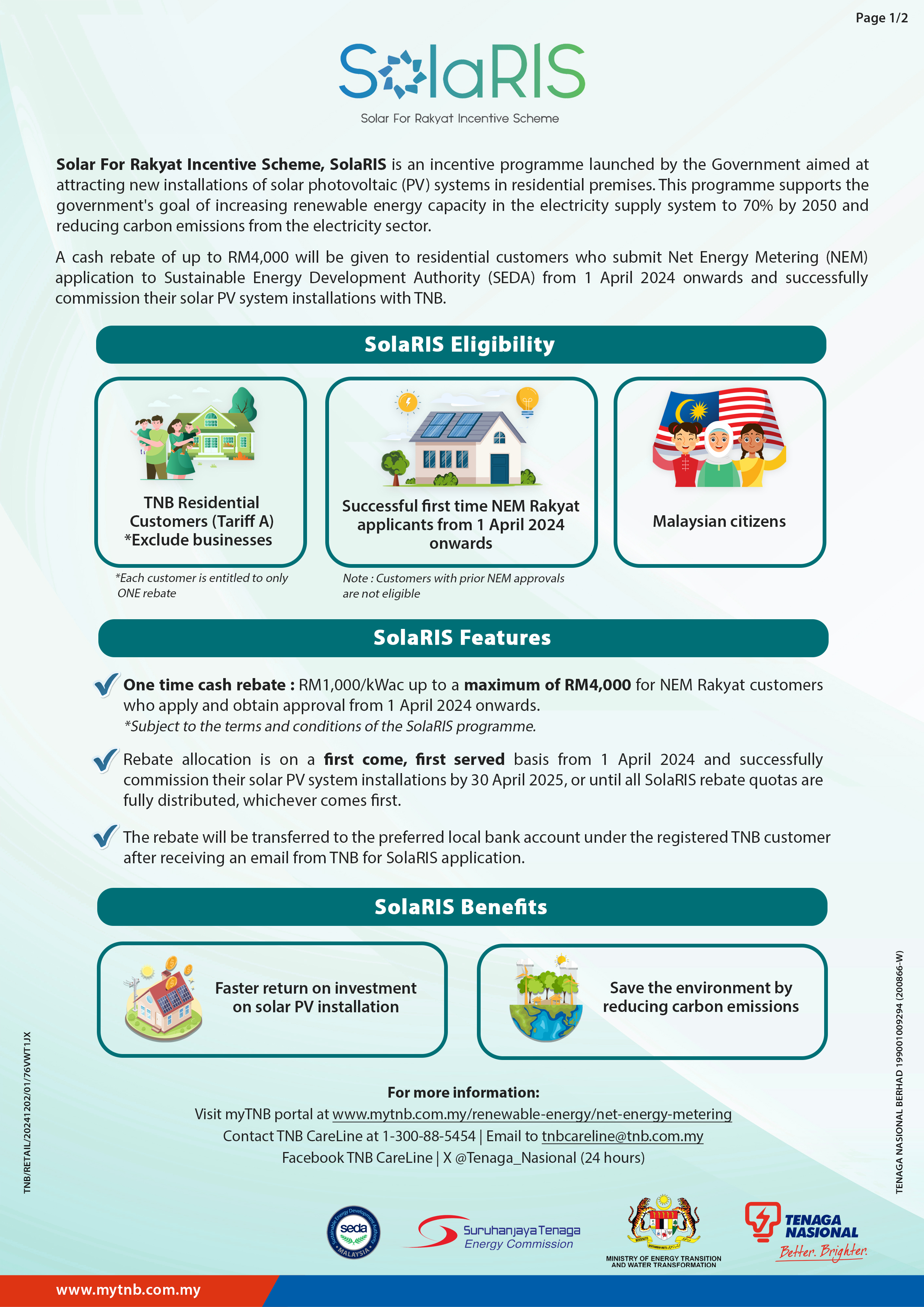 The rebate payment will only be made after the installation and commissioning of the solar PV system under the NEM Rakyat Program and will be deposited into TNB customer’s local bank account, subject to the terms and conditions of the SolaRIS programme.