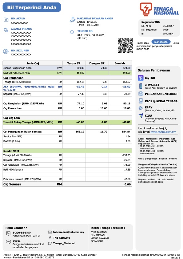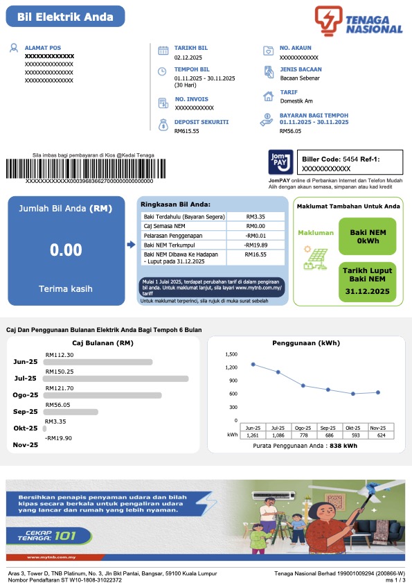Your current NEM charges (Caj Semasa NEM) are applied based on the current month. View the breakdown in more details on the second page of your bill.