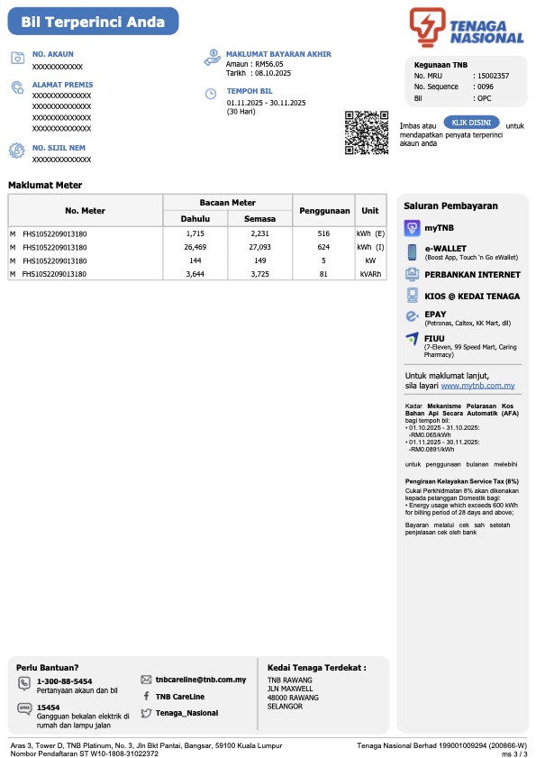 Billing Period (Tempoh Bil): The billing period reflects the duration of the bill based on start and end date of reading taken.